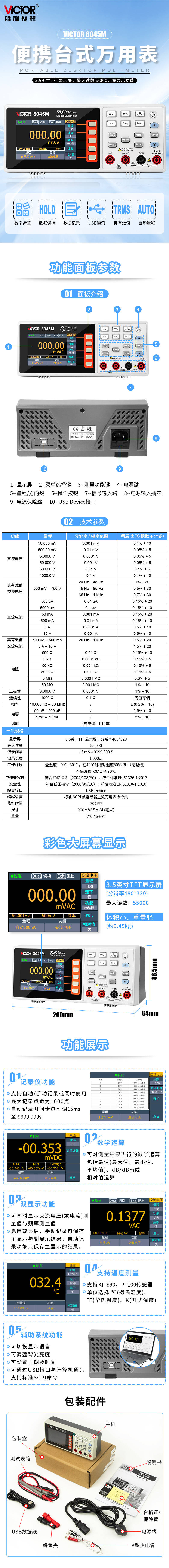 VICTOR 8045M是一款便攜式四位半臺(tái)式數(shù)字萬(wàn)用表,搭配3.5英寸高分辨率TFT液晶顯示,最大讀數(shù)55000,直流電壓準(zhǔn)確度達(dá)0.05%,集交直流電壓、交直流電流、電阻、電容、通斷測(cè)試、二極管測(cè)試、溫度測(cè)量、交流+頻率測(cè)量、最大值/最小值/平均值、相對(duì)值測(cè)量等眾多測(cè)量功能于一身,配合記錄功能,可長(zhǎng)時(shí)間監(jiān)控及分析被測(cè)物數(shù)據(jù)的變化情況,還可以通過(guò)USB接口與計(jì)算機(jī)通訊以實(shí)現(xiàn)遠(yuǎn)程控制。