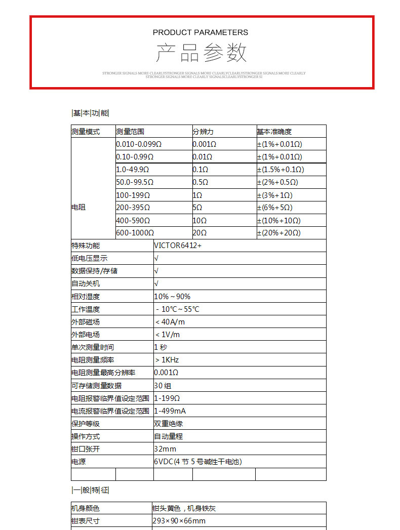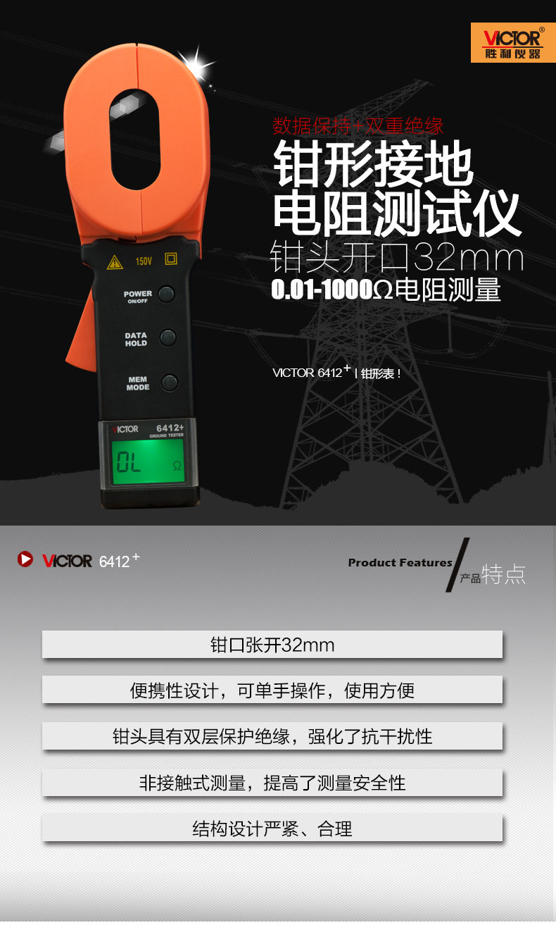 產(chǎn)品型號:VICTOR 6412+ 操作方式:自動量程產(chǎn)品名稱:接地電阻測試儀VICTOR 6412+ 顯示位數(shù):3 1 2位|基|本|功|能|測量模式測量范