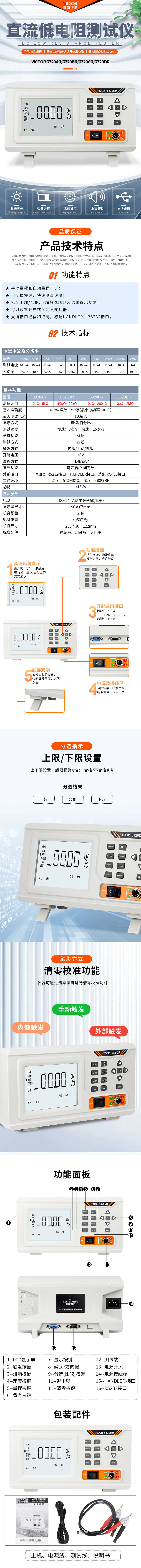 VICTOR 6320系列直流低電阻測試儀是專為用于測量各種直流中、低值電阻而設(shè)計的,儀器采用大屏LCD顯示,清晰顯示,手動/自動量程方式可調(diào),還附帶了分選功能和分選結(jié)果輸出功能,同時也支持接口通信和控制,標配HANDLER、RS232接口,可用PC、PLC等上位機通信,集眾多優(yōu)點于一身,極大地提高了本儀器的測量效果。