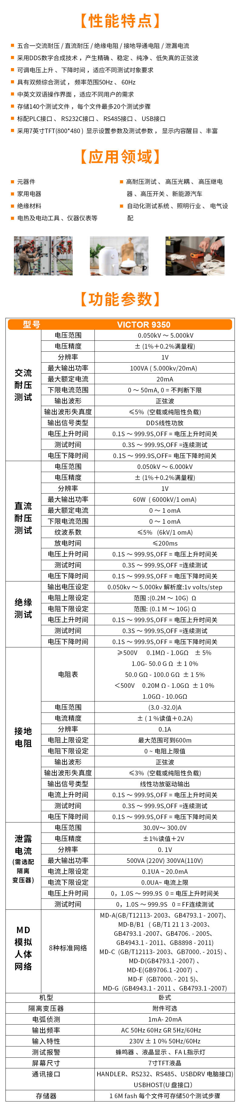 VICTOR 9350具有交流耐壓 / 直流耐壓 / 絕緣電阻 / 接地導(dǎo)通電阻 / 泄漏電流測試功能,是一款五合一多功能的安規(guī)綜合測試儀 ,一站多任務(wù)解決所有安全顧慮,是系統(tǒng)整合 、實(shí)驗(yàn)研發(fā)的優(yōu)先解決方案 。一臺機(jī)滿足所有安規(guī)測試 。