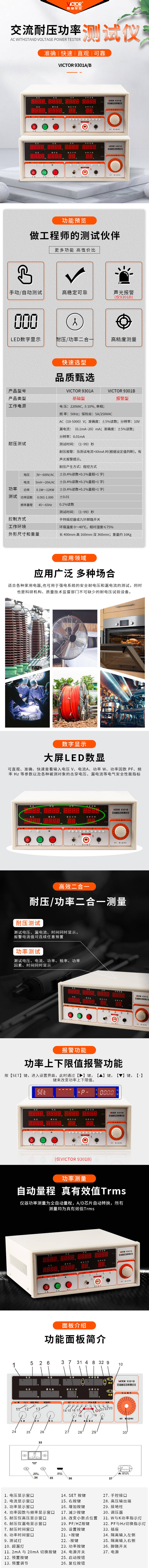 VICTOR 9301系列交流耐壓功率測試儀是一款二合一的安規(guī)綜合測試儀器,能在同一臺機器上進行兩個參數(shù)的連續(xù)測試。該產(chǎn)品結(jié)合眾多用戶的實際使用情況中,并加以提高、完善、自動化程度高,是國內(nèi)同擋機型中性價比較優(yōu)的產(chǎn)品。儀器將完善的功能、優(yōu)越的性能及簡單的操作結(jié)合在一起,可以直觀、準確、快速的測量出被測產(chǎn)品的輸入電壓V、電流A、功率W、功率因數(shù)PF、頻率Hz等參數(shù)以及各種被測對象的擊穿電壓、漏電流等電氣安全性能指標。