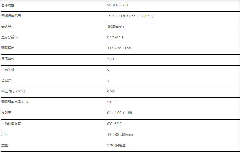 Product featuresVICTOR 308D是一種專業(yè)手持式非接觸紅外線測溫儀,具有激光瞄準,寬帶光源LCD顯示器,