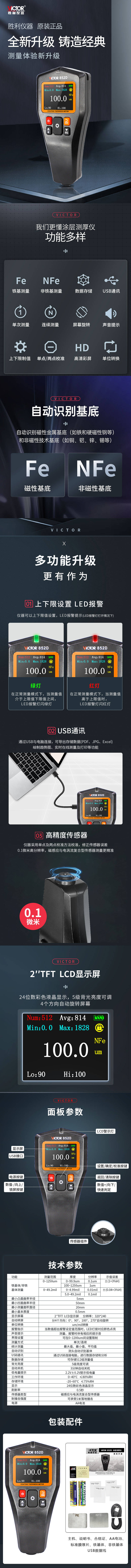 VICTOR852D是一款綜合鐵基體(FE)、非鐵基體(NFE)測(cè)量的高性能復(fù)合型涂層測(cè)厚儀,基于電磁感應(yīng)和電渦流測(cè)量原理,測(cè)量磁性金屬基體上非磁性覆蓋層與非磁性金屬基體上非導(dǎo)電覆層的厚度,其具有精度高、性能穩(wěn)定可靠、無(wú)損害測(cè)量等特點(diǎn),還具有單點(diǎn)、多點(diǎn)平均算法和快速判定等功能,是汽車制造、銷售、評(píng)估以及金屬加工、涂裝、檢驗(yàn)等行業(yè)的常用儀表