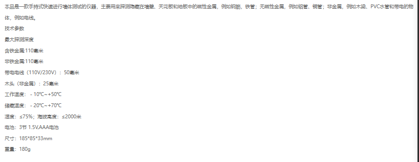 產(chǎn)品型號(hào):VICTOR 518 產(chǎn)品名稱(chēng):墻體探測(cè)儀,本品是一款手持式快速進(jìn)行墻體測(cè)試的儀器,主要用來(lái)探測(cè)隱藏在