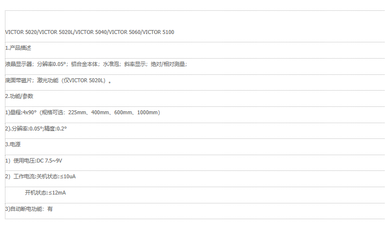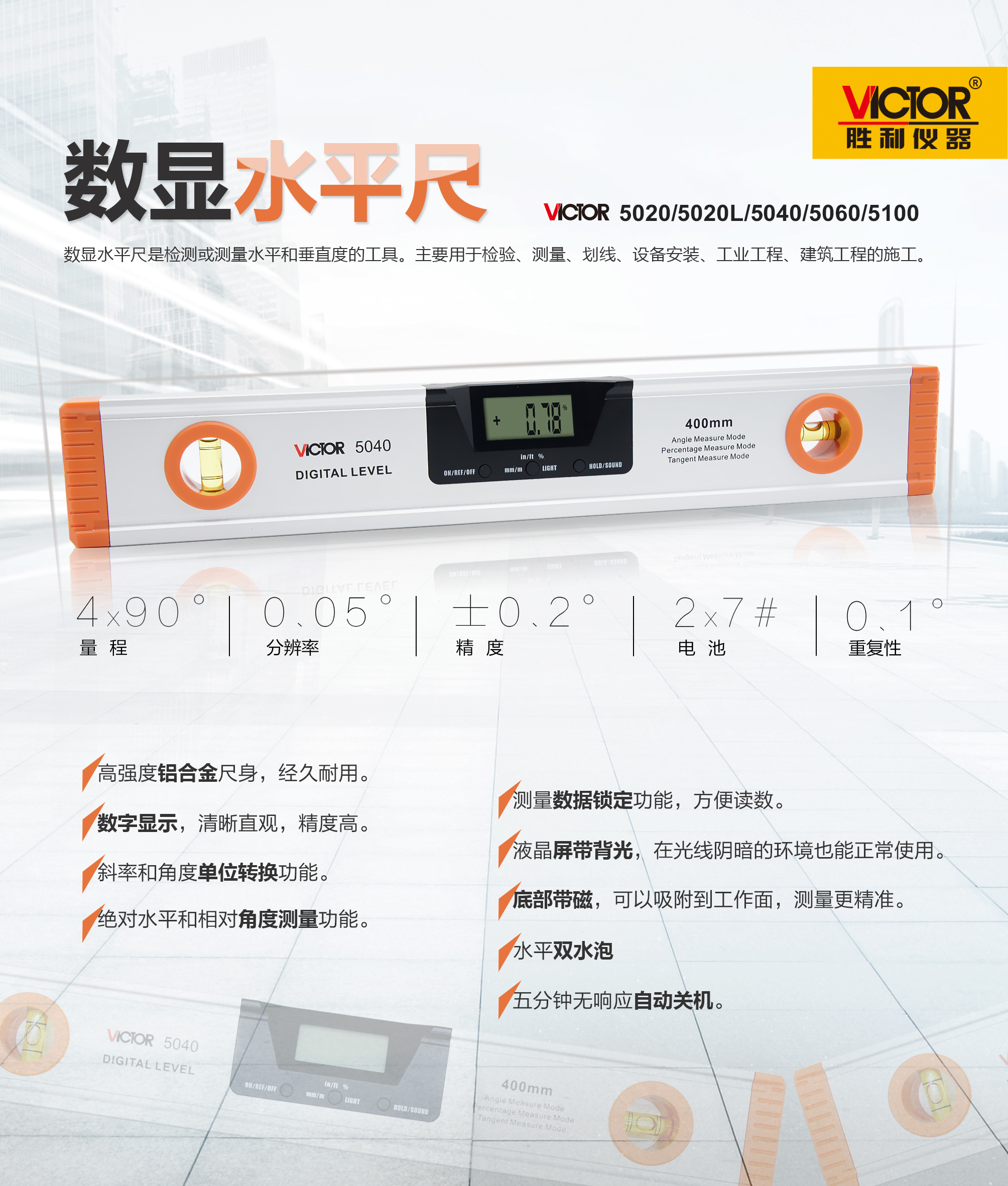 產(chǎn)品型號:VICTOR 5020 VICTOR 5020L VICTOR 5040 VICTOR 5060 VICTOR 5100操作方式:自動量程產(chǎn)品名稱:數(shù)顯水平尺