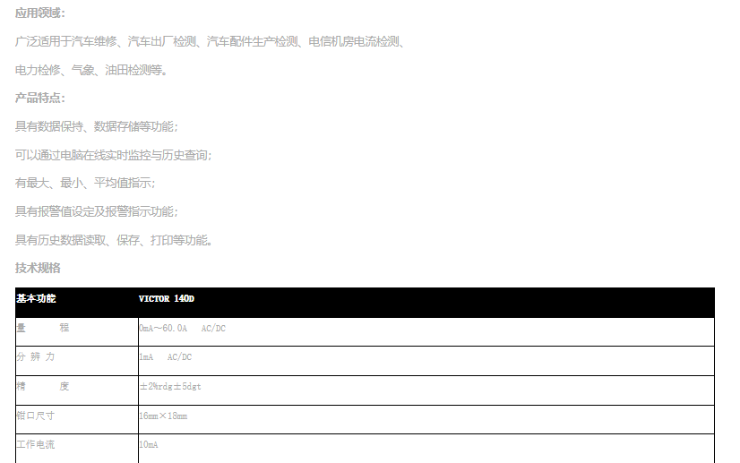 VICTOR 140D直流/交流鉗形漏電流表是專為測量汽車暗電流、漏電流等而精心 設(shè)計(jì)制造的,采用CT及數(shù)字集成技術(shù),非接觸測量,無需斷開線路,快速、安 全、可靠。儀表體積小、精度高、抗干擾能力強(qiáng)、全自動(dòng)換檔。適用于汽車漏電 流快速檢測、功耗電流檢測,能快速查找如線束斷裂漏電、電器逃電、線路搭鐵 等故障,測量馬達(dá)啟動(dòng)電流、發(fā)電機(jī)充電電流等。