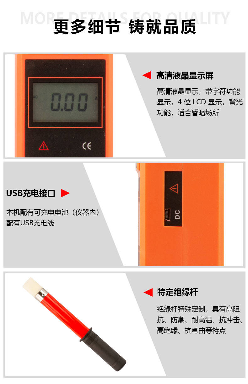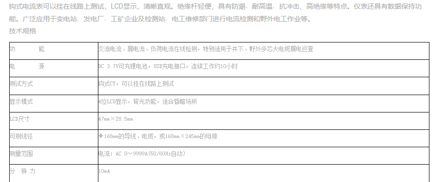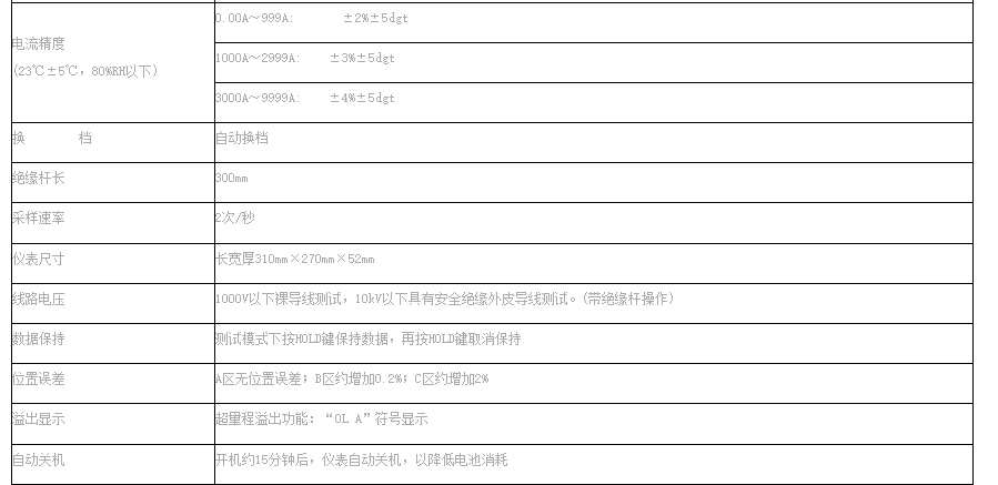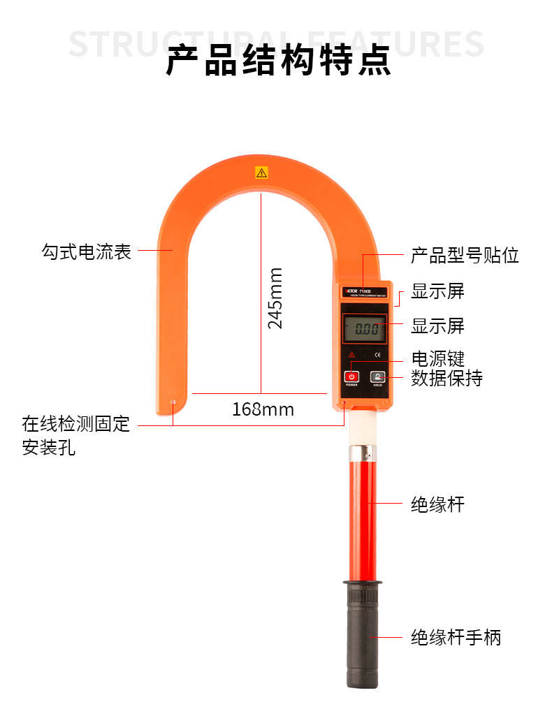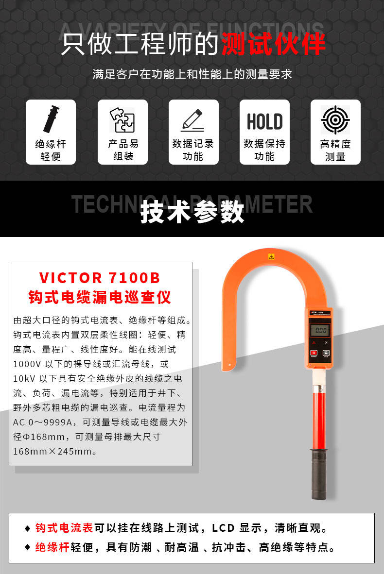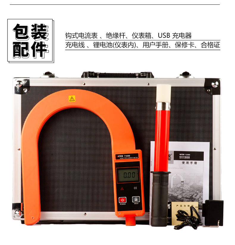 VICTOR 7100B鉤式大電流表又叫鉤式電纜漏電巡查儀,由超大口徑的鉤式電流表、絕緣桿等組成。鉤式電流表內(nèi)置雙層柔性線圈:輕便、精度高、量程廣、線性度好。能在線測試1000V以下的裸導(dǎo)線或匯流母線,或10kV以下具有安全絕緣外皮的線纜之電流、負(fù)荷、漏電流等,特別適用于井下、野外多芯粗電纜的漏電巡查。電流量程為AC 0~9999A,可測量導(dǎo)線或電纜最大外徑Ф168mm,可測量母排最大尺寸168mm×245mm。