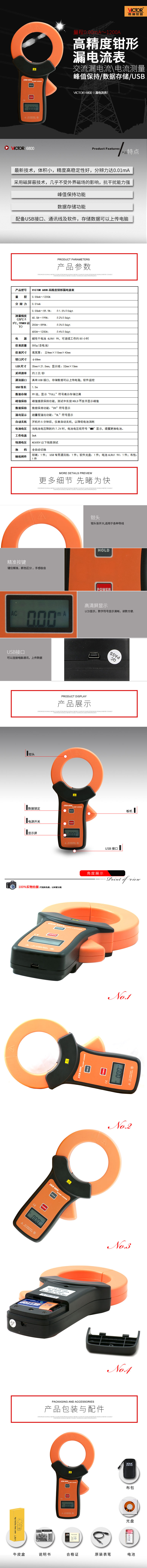 產(chǎn)品型號(hào):victor 6800 操作方式:自動(dòng)量程產(chǎn)品名稱:鉗形漏電流表 功能交流漏電流測(cè)量,交流電流測(cè)量。產(chǎn)品特點(diǎn)1