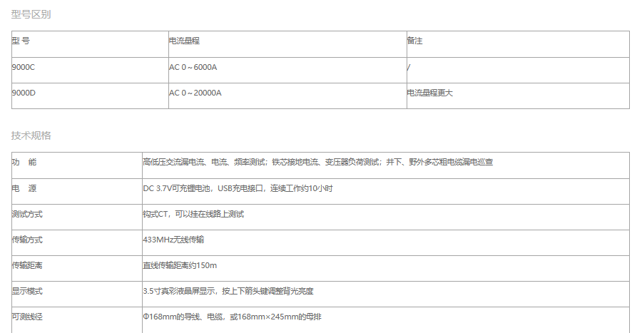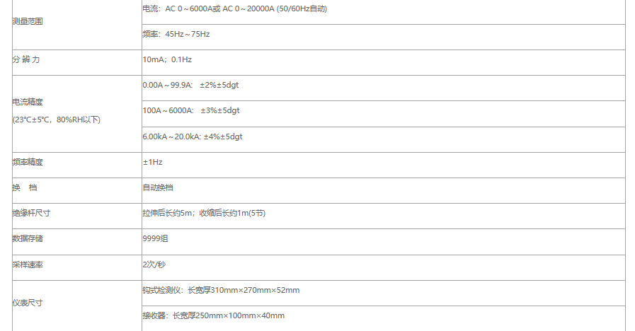 VICTOR 9000C/D無線高低壓鉤式電流表由超大口徑的鉤式檢測儀、無線接收器、伸縮絕緣桿等組成。鉤式檢測儀內(nèi)置雙層柔性線圈:輕便、精度高、量程廣、線性度好。連接伸縮絕緣桿,能在線測試35kV以下的裸導(dǎo)線或匯流母線,或110kV以下具有安全絕緣外皮的線纜之漏電流、電流、頻率、負(fù)荷等,特別適用于井下、野外多芯粗電纜的漏電巡查,變壓器負(fù)荷檢測。無線接收數(shù)據(jù)直線距離約150米,電流量程為AC 0~6000A或0~20000A可選,測量導(dǎo)線或電纜最大外徑Ф168mm,可測量母排最大尺寸168mm×245mm。 鉤式檢測儀可以掛在線路上測試,節(jié)省操作人員體力。接收器采用3.5寸真彩液晶屏,圖形界面顯示,直觀清晰。絕緣桿輕便、具有防潮、耐高溫、抗沖擊、高絕緣、可伸縮等特點。儀表還具有數(shù)據(jù)保持、數(shù)據(jù)存儲等功能,廣泛應(yīng)用于變電站、發(fā)電廠、工礦企業(yè)以及檢測站、電工維修部門進(jìn)行電流檢測和野外電工作業(yè)等。