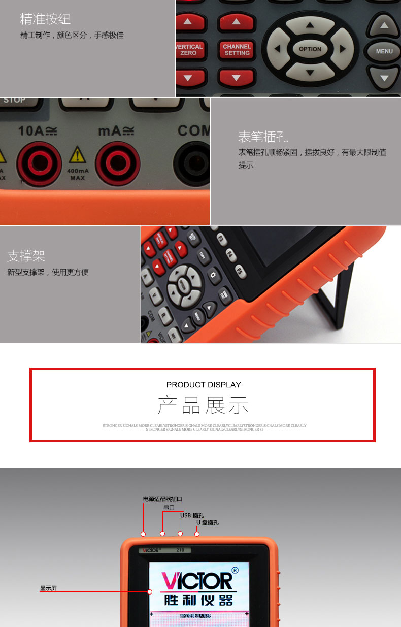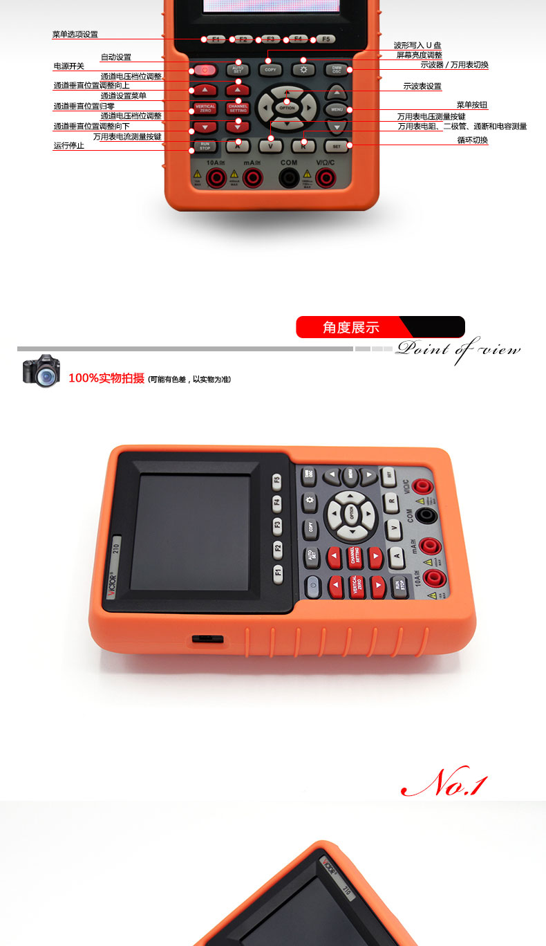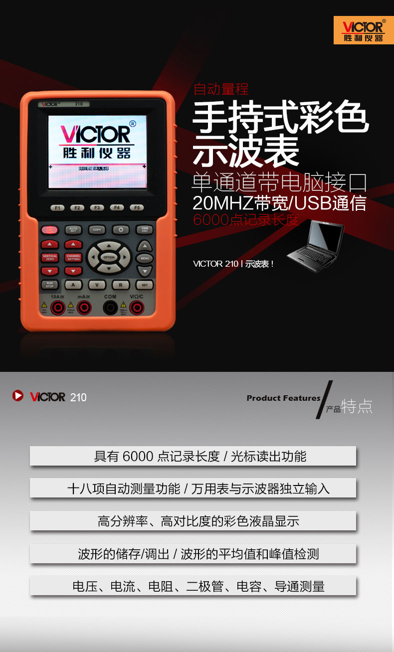 產(chǎn)品型號:VICTOR 210 操作方式:自動量程產(chǎn)品名稱:手持式示波表VICTOR 210