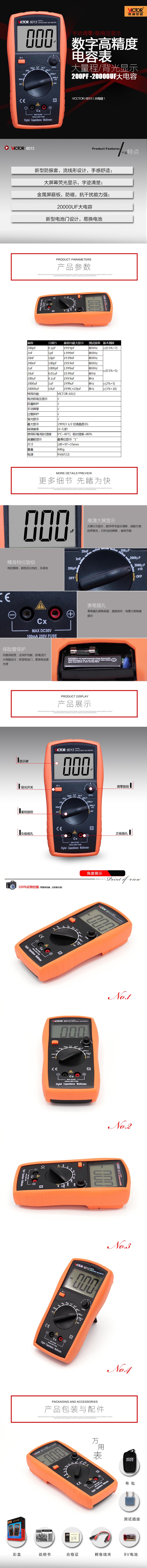 產品型號:VC6013操作方式:手動量程產品名稱:數字電容表VC6013顯示位數:3 1 2位VICTOR6013電容表量程分辨力量程內最大顯示測試頻率基本