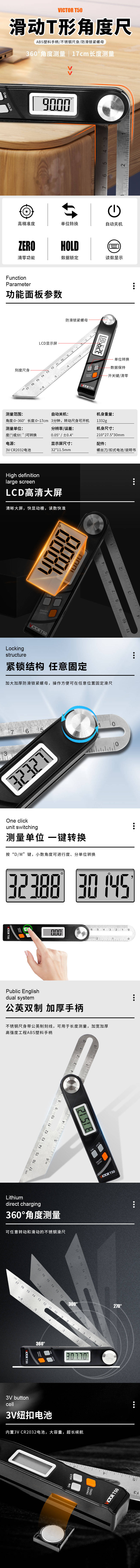 VICTOR T50 數(shù)顯滑動T形角度尺,綜合了鋼直尺、傳統(tǒng)的木工活動角尺和數(shù)顯角度尺的特點,具有角度測量范圍0-360°以及0-17cm的長度測量范圍,特別適合木工精密測量、鋸片角度設置等使用場景。