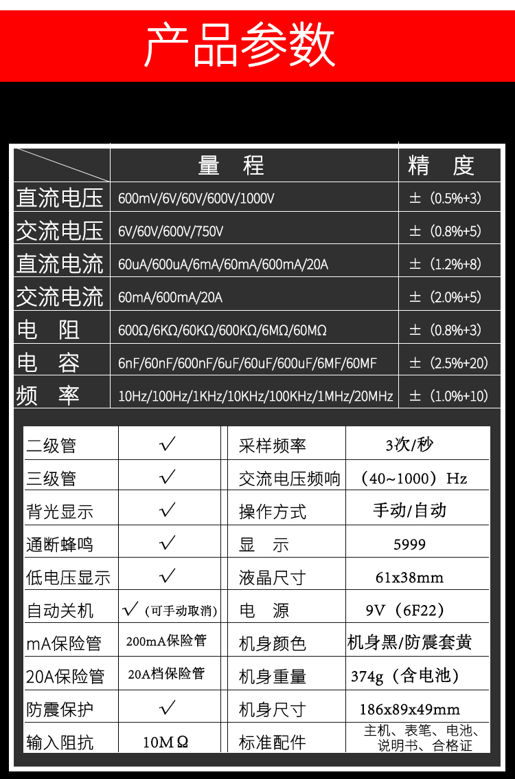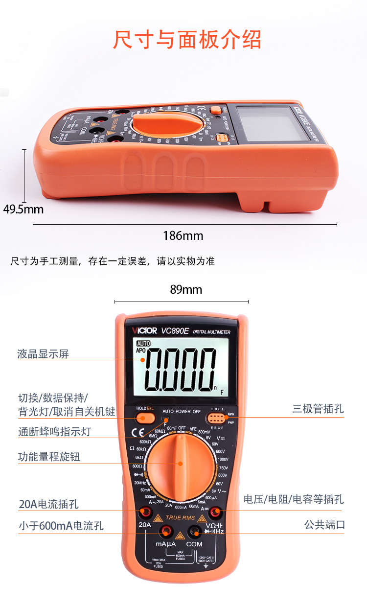 產(chǎn)品型號(hào):VICTOR 890E 操作方式:自動(dòng)量程產(chǎn)品名稱(chēng):數(shù)字萬(wàn)用表 顯示位數(shù):3 1 2位