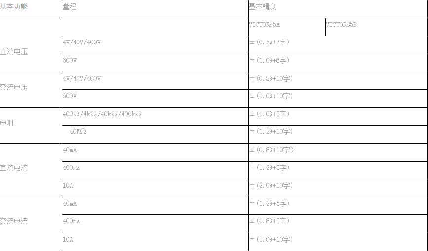 產(chǎn)品型號(hào):VICTOR 85A B 操作方式:自動(dòng)量程產(chǎn)品名稱:數(shù)字萬用表 顯示位數(shù): 說明書下載基本功能量程基本精度VICTOR85AVI