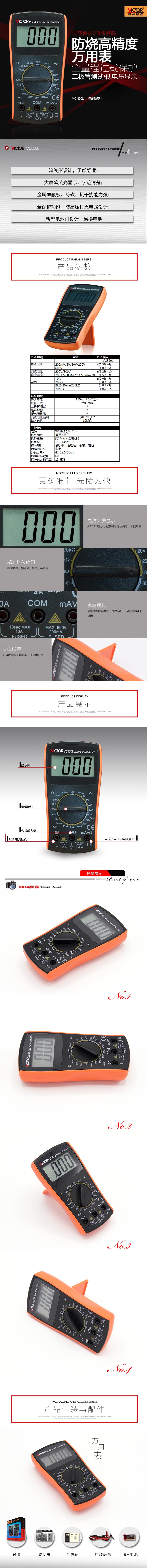 產(chǎn)品型號(hào):VC830L操作方式:手動(dòng)量程產(chǎn)品名稱:數(shù)字萬用表VC830L顯示位數(shù):3 1 2位特點(diǎn):1、外觀小巧精致美觀,手感舒適;2、大屏幕顯示,