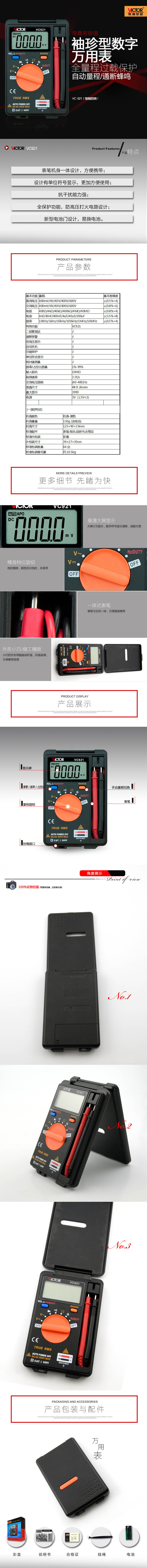 產(chǎn)品型號(hào):VC921操作方式:自動(dòng)量程產(chǎn)品名稱:數(shù)字萬(wàn)用表VC921顯示位數(shù):3 3 4位特點(diǎn):1、設(shè)計(jì)有單位符號(hào)顯示,更加方便使用;2、抗干擾能