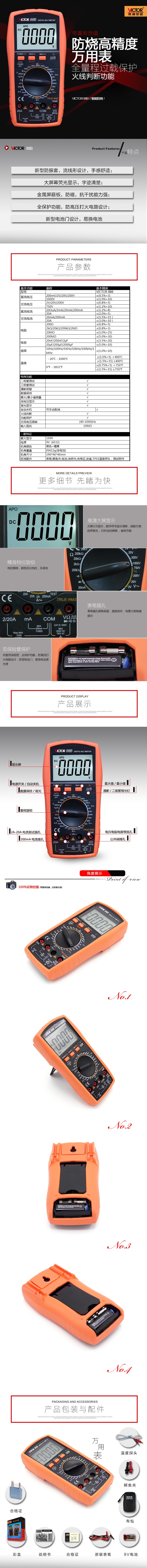 產(chǎn)品型號(hào):VICTOR 88B操作方式:手動(dòng)量程產(chǎn)品名稱:數(shù)字萬用表VICTOR 88B顯示位數(shù):3 1 2位特點(diǎn):1、新型防振套,流線形設(shè)計(jì),手感舒適