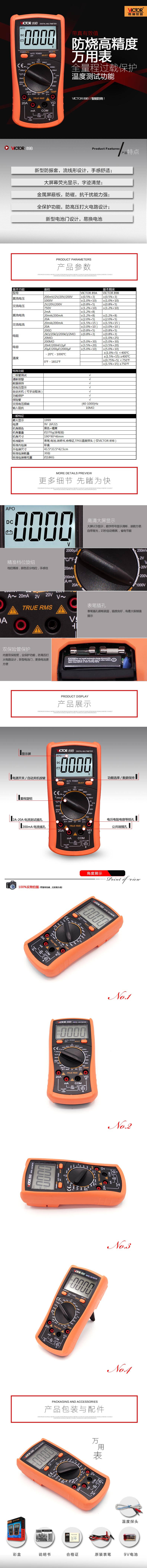 產(chǎn)品型號:VICTOR 89B操作方式:手動量程產(chǎn)品名稱:數(shù)字萬用表VICTOR 89B顯示位數(shù):3 1 2位特點:1、新型防振套,流線形設(shè)計,手感舒適