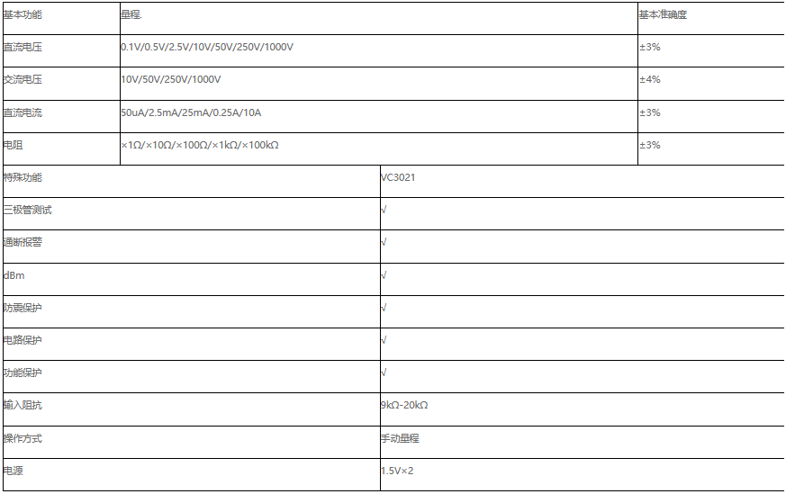 產(chǎn)品型號:VC3021操作方式:手動量程產(chǎn)品名稱:指針萬用表VC3021顯示位數(shù):3 1 2位基本功能量程 基本準(zhǔn)確度直流電壓0 1V 0 5V 2 5V 10V 50
